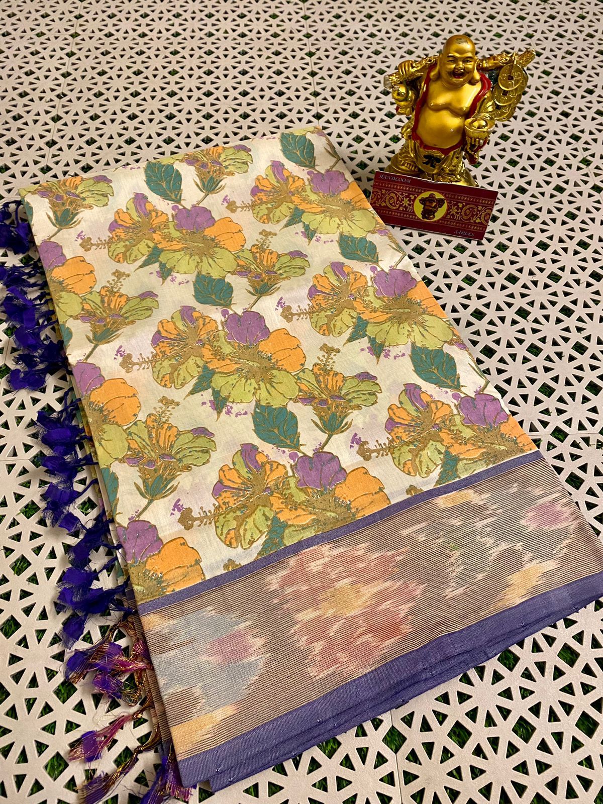 Pure Handloom Kanchi Cotton Silk Sarees With Beautiful nd Classy Screen prints Allover, Pure Handloom Cotton silk Sarees Comes in Beautiful Combinations With Contrast Zari Weaving Pochampalli Borders, Contrast Pallu With Prints along with Tassels – Contrast Blouse. “SILKBAZAAR MY”