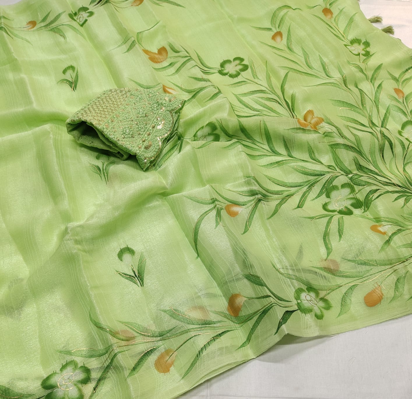 Soft Uppada Silk ( Two -Tone) Saree With Antique Jari Embroidery Work Butta allover and Beautiful Fulna, Contrast Beautiful Foil Print Blouse. “SILKBAZAAR MY”